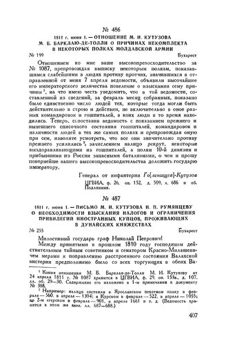 1811 г. июня 1. — Письмо М.И. Кутузова Н.П. Румянцеву о необходимости взыскания налогов и ограничения привилегий иностранных купцов, проживающих в Дунайских княжествах. Бухарест // Архив ВПР МИД СССР, ф. Канцелярия МИД, д. 1960, лл. 169-176. Подлинник.