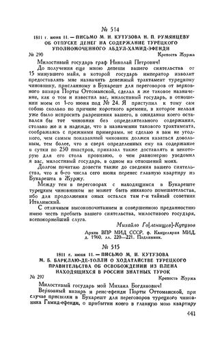 1811 г. июня 11. — Письма М.И. Кутузова Н.П. Румянцеву об отпуске денег на содержание турецкого уполномоченного Абдул-Хамид-эфенди. Крепость Журжа // Архив ВПР МИД СССР, ф. Канцелярия МИД, д. 1960, лл. 220-221. Подлинник.