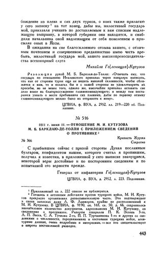 1811 г. июня 11. — Отношение М.И. Кутузова М.Б. Барклаю-де-Толли с ...