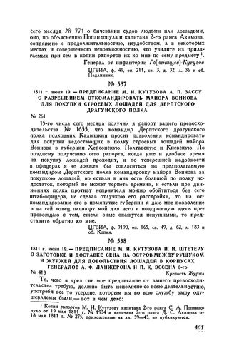 1811 г. июня 19. — Предписание М.И. Кутузова А.П. Зассу с разрешением откомандировать майора Воинова для покупки строевых лошадей для Дерптского драгунского полка // ЦГВИА, ф. 9190, оп. 165, св. 49, д. 62, л. 183 и об. Копия.
