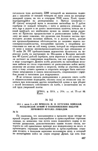 1811 г. июля 5. — Из приказа М.И. Кутузова войскам Молдавской армии о возобновлении выдачи зернового фуража лошадям