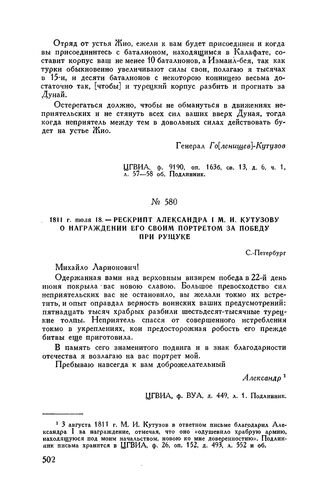 1811 г. июля 18. — Рескрипт Александра I М.И. Кутузову о награждении его своим портретом за победу при Рущуке. С.-Петербург