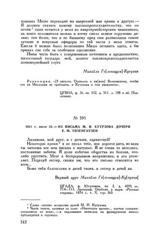 Главная Русские полководцы Русские полководцы. М.И. Кутузов М.И. Кутузов Т3 Документы 1811 г. июля 23. — Из письма М.И. Кутузова дочери Е.М. Тизенгаузен