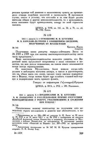 Главная Русские полководцы Русские полководцы. М.И. Кутузов М.И. Кутузов Т3 Документы 1811 г. августа 3. — Отношение М.И. Кутузова М.Б. Барклаю-де-Толли ...