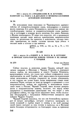 1811 г. августа 14. — Рапорт А.П. Засса М.И. Кутузову о просьбе Кара-Георгия помочь сербам в их борьбе с Турцией. Лагерь при Видине