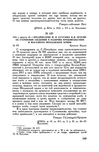 1811 г. августа 15. — Предписание М.И. Кутузова Ф.Ф. Эртелю об уточнении сведений о наличии продовольствия в магазинах Молдавской армии. Крепость Журжа // ЦГВИА, ф. 49, оп. 211, св. 3, д. 32, лл. 56-57. Подлинник.