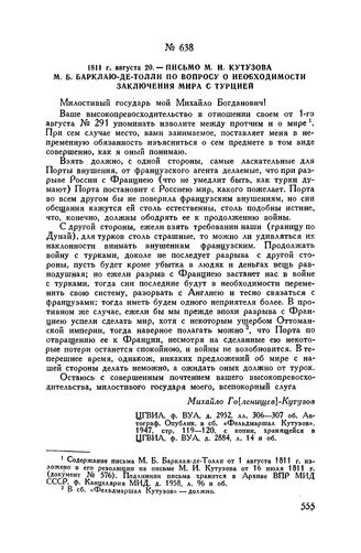 1811 г. августа 20. — Письмо М.И. Кутузова М.Б. Барклаю-де-Толли по вопросу о необходимости заключения мира с Турцией // ЦГВИА, ф. ВУА, д. 2952, лл. 306-307 об. Автограф. Опублик. в сб. «Фельдмаршал Кутузов», 1947, стр. 119-120, с копии, хранящейся в ЦГВИА, ф. ВУА, д. 2884, л. 14 и об.