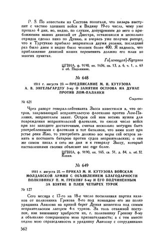 1811 г. августа 23. — Предписание М.И. Кутузова А.В. Энгельгардту 3-му о занятии острова на Дунае против Лом-Паланки // ЦГВИА, ф. 9190, оп. 165, св. 51, д. 84, л. об. 32. Копия.
