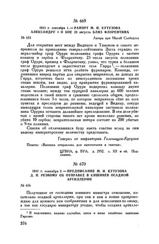 1811 г. сентября 1. — Рапорт М.И. Кутузова Александру I о бое 23 августа близ Флорентина. Лагерь при Малой Слободзее // ЦГВИА, ф. ВУА, д. 2952, л. 321 и об. Подлинник.