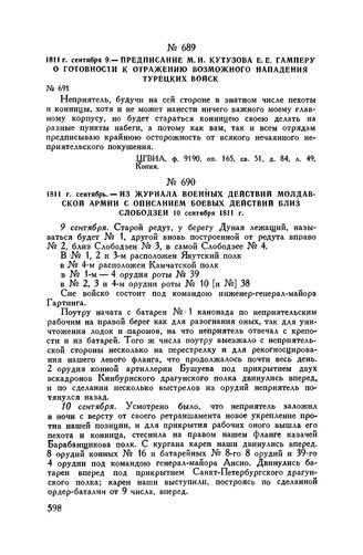 1811 г. сентябрь. — Из журнала военных действий Молдавской армии с описанием боевых действий близ Слободзеи 10 сентября 1811 г. // ЦГВИА, ф. ВУА, д. 2953, лл. 9-10. Подлинник.