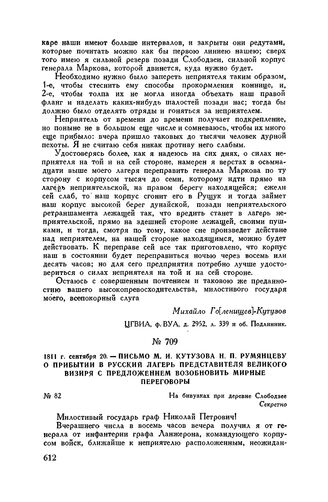 1811 г. сентября 20. — Письмо М.И. Кутузова Н.П. Румянцеву о прибытии в русский лагерь представителя великого визиря с предложением возобновить мирные переговоры. На бивуаках при деревне Слободзее