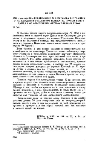 1811 г. сентября 26. — Предписание М.И. Кутузова Е.Е. Гамперу о награждении участников поиска на правом берегу Дуная и об обеспечении обувью пленных турок // ЦГВИА, ф. 9190, оп. 165, св. 50, д. 71, лл. 145-146. Копия.