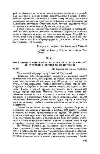 1811 г. октября 2. — Письмо М.И. Кутузова Н.П. Румянцеву об отправке в Сербию 700 000 патронов. На бивуаках при деревне Слободзее