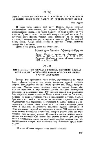 1811 г. октября 3. — Письмо М.И. Кутузова Е.И. Кутузовой о взятии визирского лагеря на правом берегу Дуная. Близ Журжи // Архив Института литературы Академии наук СССР, ф. 358, оп. 1, кн. 2, л. 8, № 21/299. Автограф. Опублик. в журн. «Русская старина», 1872 г., т. V, стр. 265.