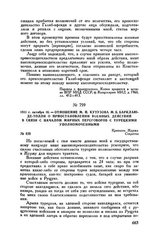 1811 г. октября 16. — Отношение М.И. Кутузова М.Б. Барклаю-де-Толли о приостановлении военных действий в связи с началом мирных переговоров с турецкими уполномоченными. Крепость Журжа // ЦГВИА, ф. ВУА, д. 2952, л. 367 и об. Подлинник. Опублик. в сб. «Фельдмаршал Кутузов», 1947, стр. 132-133.