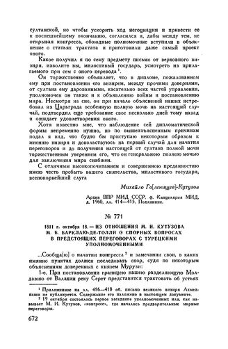 Главная Русские полководцы Русские полководцы. М.И. Кутузов М.И. Кутузов Т3 Документы 1811 г. октября 18. — Из отношения М.И. Кутузова М.Б. Барклаю-де-То...
