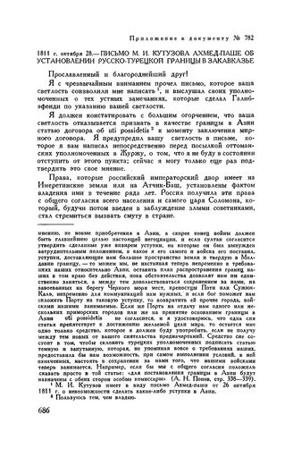 Приложение к письму М.И. Кутузова Н.П. Румянцеву. Письмо М.И. Кутузова Ахмед-паше об установлении русско-турецкой границы в Закавказье // Архив ВПР МИД СССР, ф. Канцелярия МИД, д. 1960, л. 440 и об. Перевод с французского.