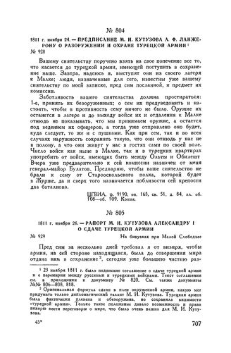 1811 г. ноября 26. — Рапорт М.И. Кутузова Александру I о сдаче турецкой армии. На бивуаках при Малой Слободзее // ЦГВИА, ф. ВУА, д. 2952, лл. 373-374. Подлинник.