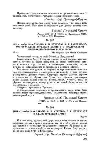 Главная Русские полководцы Русские полководцы. М.И. Кутузов М.И. Кутузов Т3 Документы 1811 г. ноября 26. — Письмо М.И. Кутузова М.Б. Барклаю-де-Толли о с...