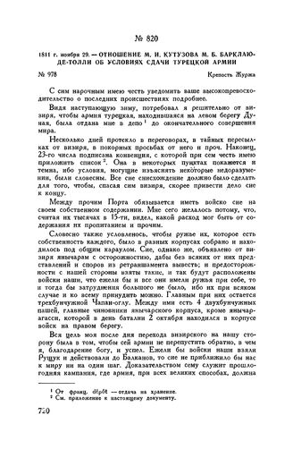 1811 г. ноября 29. — Отношение М.И. Кутузова М.Б. Барклаю-де-Толли об условиях сдачи турецкой армии. Крепость Журжа // ЦГВИА, ф. ВУА, д. 434, лл. 67-68 об. Подлинник. Опублик. в сб. «Отечественная война 1812 г. Материалы ВУА», т. VI, СПБ, 1903, стр. 345-346.
