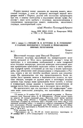 1812 г. января 3. — Письмо М.И. Кутузова Н.П. Румянцеву о разрыве перемирия с Турцией и прекращении мирных переговоров. Бухарест // Архив ВПР МИД СССР, ф. Канцелярия МИД, д. 1982, лл. 28-31. Подлинник. Частично опублик. в книге А.Н. Попова, Отечественная война 1812 г., т. 1, М., 1905, стр. 352, 354-355.