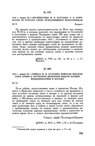 1812 г. января 25. — Приказ М.И. Кутузова войскам Молдавской армии о частичной денежной выдаче взамен продовольствия и фуража // ЦГВИА, ф. ВУА, д. 2964, л. 16 и об. Подлинник.