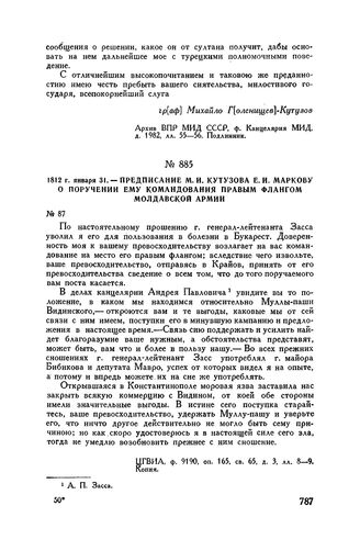 1812 г. января 31. — Предписание М.И. Кутузова Е.И. Маркову о поручении ему командования правым флангом Молдавской армии // ЦГВИА, ф. 9190, оп. 165, св. 65, д. 3, лл. 8-9. Копия.