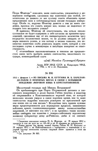 1812 г. февраля 1. — Из письма М.И. Кутузова М.Б. Барклаю-де-Толли о принятых мерах в связи с вспышкой эпидемии «моровой язвы» в Константинополе