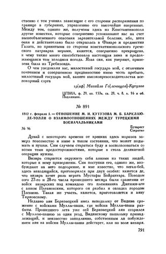 1812 г. февраля 1. — Отношение М.И. Кутузова М.Б. Барклаю-де-Толли ...