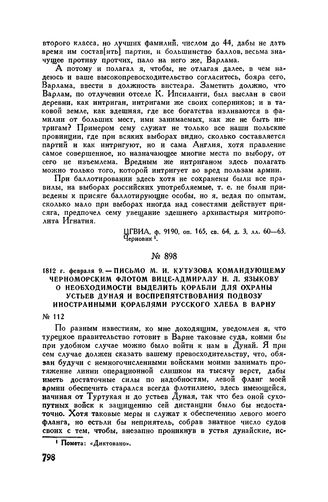 1812 г. февраля 9. — Письмо М.И. Кутузова командующему Черноморским флотом вице-адмиралу Н.Л. Языкову о необходимости выделить корабли для охраны устьев Дуная и воспрепятствования подвозу иностранными кораблями русского хлеба в Варну // ЦГВИА, ф. 9190, оп. 165, св. 65, д. 3, лл. об. 15-об. 16. Копия.