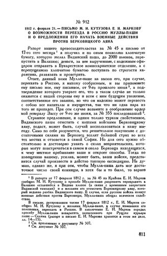 1812 г. февраля 21. — Письмо М.И. Кутузова Е.И. Маркову о возможности переезда в Россию Муллы-паши и о предложении его начать военные действия против Берковицкого аяна // ЦГВИА, ф. 9190, оп. 165, св. 68, д. 47, лл. 16-17 об. Отпуск.