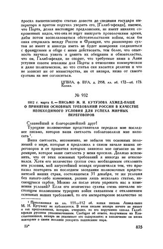 1812 г. марта 6. — Письмо М.И. Кутузова Ахмед-паше о принятии основных требований России в качестве необходимого условия для успеха мирных переговоров