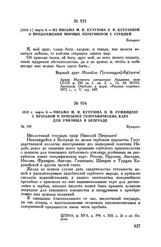 1812 г. марта 6. — Письмо М.И. Кутузова Н.П. Румянцеву с просьбой о присылке географических карт для училища в Белграде. Бухарест // ЦГВИА, ф. ВУА, д. 394, ч. XII, л. 26 и об. Отпуск.