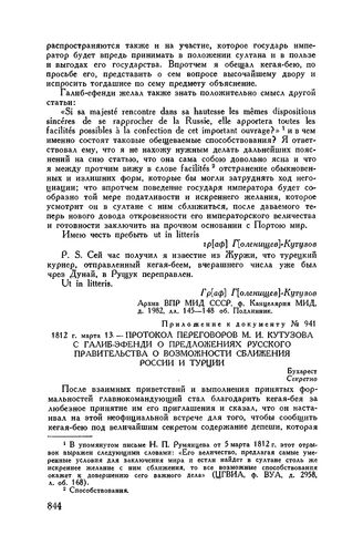 Приложение к письму М.И. Кутузова Н.П. Румянцеву. 1812 г. марта 13. — Протокол переговоров М.И. Кутузова с Галиб-эфенди о предложениях русского правительства о возможности сближения России и Турции. Бухарест // Архив ВПР МИД СССР, ф. Канцелярия МИД, д. 1982, лл. 149-152. Перевод с французского.