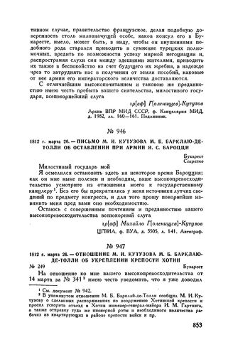 1812 г. марта 26. — Письмо М.И. Кутузова М.Б. Барклаю-де-Толли об оставлении при армии И.С. Бароцци. Бухарест // ЦГВИА, ф. ВУА, д. 3505, л. 141. Автограф.