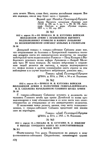 1812 г. апреля 19. — Из приказа М.И. Кутузова войскам Молдавской армии с объявлением выговора подполковнику Руммелю и майору Лукьянову за несвоевременную отправку больных в госпитали // ЦГВИА, ф. ВУА, д. 2964, л. 54 и об. Подлинник.