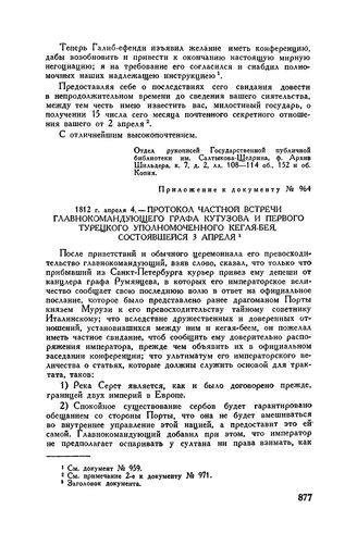Приложение к письму М.И. Кутузова Н.П. Румянцеву. 1812 г. апреля 4. — Протокол частной встречи главнокомандующего графа Кутузова и первого турецкого уполномоченного кегая-бея, состоявшейся 3 апреля