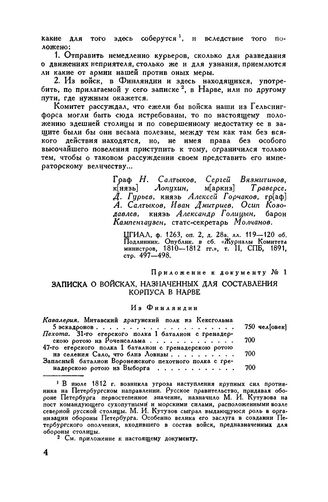 Приложение к журналу чрезвычайного заседания Комитета министров 1812 г. июля 12. Записка о войсках, назначенных для составления корпуса в Нарве // ЦГИАЛ, ф. 1263, оп. 2, д. 28а, л. 128. Подлинник. Опублик. в сб. «Журналы Комитета министров, 1810-1812 гг.», т. II, СПБ, 1891, приложение V, стр. 707.