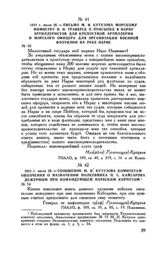 1812 г. июля 26. — Письмо М.И. Кутузова морскому министру И.И. Траверсе о присылке в Нарву артиллеристов для крепостной артиллерии и морского офицера для организации военной флотилии на реке Нарве // ГИАЛО, ф. 189, св. 40, д. 219, л. 56 и об. Копия.