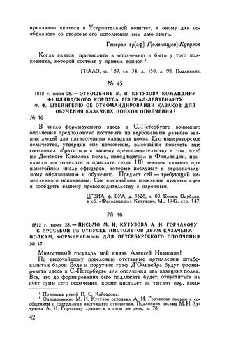 1812 г. июля 28. — Письмо М.И. Кутузова А.И. Горчакову с просьбой об отпуске пистолетов двум казачьим полкам, формируемым для Петербургского ополчения // ЦГВИА, ф. ВУА, д. 3528, л. 60 и об. Подлинник.