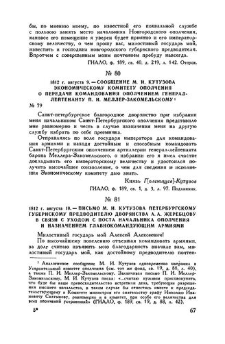 1812 г. августа 10. — Письмо М.И. Кутузова петербургскому губернскому предводителю дворянства А.А. Жеребцову в связи с уходом с поста начальника ополчения и назначением главнокомандующим армиями // ГИАЛО, ф. 189, св. 1, д. 3, л. 100 и об. Копия. Опублик. в кн.: В. Штейнгель, «Записки касательно составления и самого похода Санктпетербургского ополчения», ч. 1, СПБ, 1814, стр. 49-50, и «Материалы для истории дворянства С.-Петербургской губернии, т. II, вып. I, Ополчение 1812 г.», СПБ, 1912, стр. 62-63.