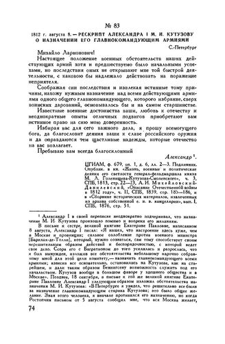 1812 г. августа 8. — Рескрипт Александра I М.И. Кутузову о назначении его главнокомандующим армиями. С.-Петербург