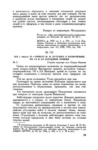 1812 г. августа 19. — Приказ М.И. Кутузова о назначениях по 1-й и 2-й Западным армиям. Главная квартира село Старая Иванова // ЦГВИА, ф. ВУА, д. 3524, лл. 2 об.-3. Подлинник. Опублик. в сб. «Отечественная война 1812 г. Материалы ВУА», т. XVI, СПБ, 1911, стр. 83-84.
