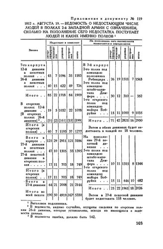 Приложение к приказу войскам 2-й Западной армии. 1812 г. августа 19. — Ведомость о недостающем числе людей в полках 2-й Западной армии с означением, сколько на пополнение сего недостатка поступает людей и каких именно полков // ЦГВИА, ф. 103, оп. 209г, св. 75, д. 76, кн. 2, л. 64 и об. Копия.