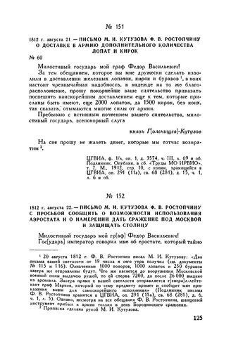 1812 г. августа 21. — Письмо М.И. Кутузова Ф.В. Ростопчину о доставке в армию дополнительного количества лопат и кирок // ЦГВИА, ф. 1/л, оп. 1, д. 3574, ч. III, л. 69 и об. Подлинник. Опублик. в сб. «Труды МО ИРВИО», т. 2, М., 1912, стр. 10, с копии, хранящейся в ЦГВИА, оп. 291 (11а), св. 68 (281), д. 15, ч. 1, л. 6 и об.
