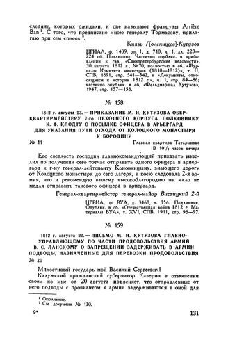 1812 г. августа 23. — Приказание М.И. Кутузова обер-квартирмейстеру 7-го пехотного корпуса полковнику К.Ф. Клодту о посылке офицера в арьергард для указания пути отхода от Колоцкого монастыря к Бородину. Главная квартира Татариново. В 10 1/2 часов вечера // ЦГВИА, ф. ВУА, д. 3468, л. 356. Подлинник. Опублик. в сб. «Отечественная война 1812 г. Материалы ВУА», т. XVI, СПБ, 1911, стр. 96-97.