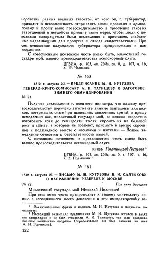 1812 г. августа 23. — Письмо М.И. Кутузова Н.И. Салтыкову о направлении резервов к Москве. При селе Бородине // ЦГИАМ, ф. 728, д. 898, л. 2. Подлинник. Опублик. в журн. «Огонек», 1945, № 37, стр. 8; там же помещена фотокопия письма.