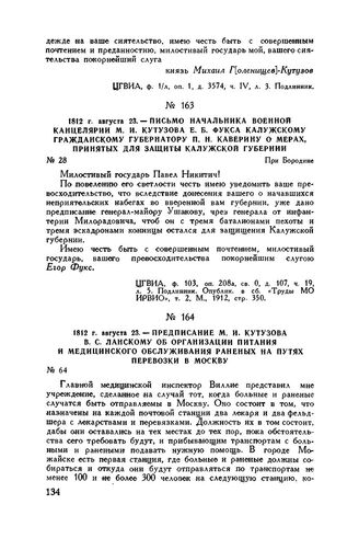 1812 г. августа 23. — Письмо начальника военной канцелярии М.И. Кутузова Е.Б. Фукса калужскому гражданскому губернатору П.Н. Каверину о мерах, принятых для защиты Калужской губернии. При Бородине // ЦГВИА, ф. 103, оп. 208а, св. 0, д. 107, ч. 19, л. 5. Подлинник. Опублик. в сб. «Труды МО ИРВИО», т. 2, М., 1912, стр. 350.