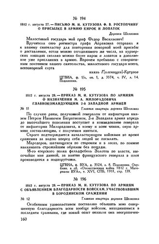 1812 г. августа 28. — Приказ М.И. Кутузова по армиям с объявлением благодарности войскам, участвовавшим в Бородинском сражении. Главная квартира деревня Шелковка // ЦГВИА, ф. ВУА, д. 3524, л. 8 и об. Подлинник. Опублик. в сб. «Отечественная война 1812 г. Материалы ВУА», т. XVI, СПБ, 1911, стр. 139-140; частично опублик. в сб. «Фельдмаршал Кутузов», 1947, стр. 174.