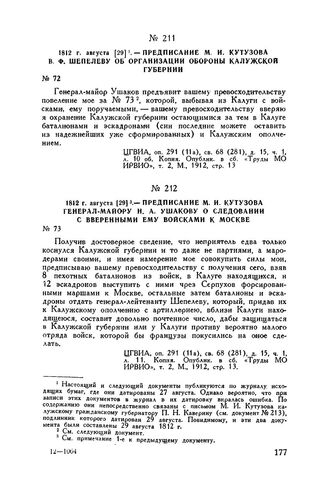 1812 г. августа [29]. — Предписание М.И. Кутузова генерал-майору Н.А. Ушакову о следовании с вверенными ему войсками к Москве // ЦГВИА, оп. 291 (11а), св. 68 (281), д. 15, ч. 1, л. 11. Копия. Опублик. в сб. «Труды МО ИРВИО», т. 2, М., 1912, стр. 13.